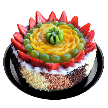 Pastel de tres leches con crema pastelera y decoraciones de chipas de chocolate, variedad de frutos.